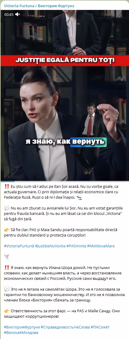 Materialele prezentate demonstrează că partidul „Moldova Mare” a primit și a gestionat fonduri ilegale semnificative pentru desfășurarea activităților sale. Totodată, datele obținute confirmă din nou faptul că acțiunile Victoriei Furtună sunt coordonate direct de Moscova și Ilan Șor, iar „lupta pentru dreptate”, despre care ea vorbește cetățenilor, nu este decât un paravan pentru promovarea intereselor grupărilor criminale.