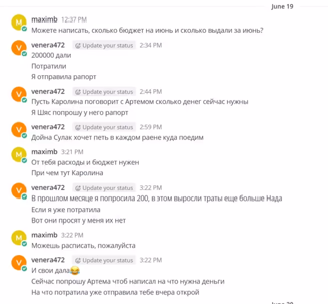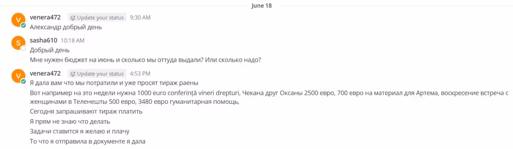 Într-o conversație din 19 iunie, Tregub o întreabă pe Furtună despre suma de bani care a fost alocată partidului pentru luna iunie. Furtună îi spune că a primit 200 mii euro, însă banii au fost deja cheltuiți.