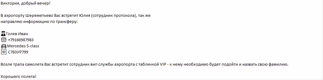 A doua zi, pe 12 august, curatorul rus o anunță că la Aeroportul Șeremetievo va fi întâmpinată de angajata Serviciului Protocol, Iulia, iar la ieșirea din avion de un angajat VIP, la care trebuie să se prezinte.